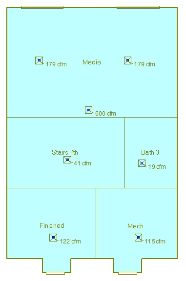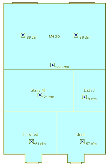 For example: Let’s look at the house shown in the two photos above. The house is well insulated, and the load up there is pretty small on this upper level. The Manual-J software says that you’ll only need a total of 298 CFM (the one that says 298 is a return – one slash) to maintain the indoor design conditions. Chances are, you’ll be installing a 1.5-ton system up there, because that’s the smallest split-system made that is reasonably priced. In this scenario, you’d want to make sure your ductwork is sized to move 600 CFM, not 298. Notice that the software splits up the “extra” air proportionally for this level. Now, instead of the Media room requiring two ducts that deliver 178 cfm total, it actually needs two (or more) ducts that each deliver a total of 358 cfm. That’s twice as much air! You’d obviously want larger ducts to move all of this extra air. Otherwise, you’d be choking your system and never achieve the advertised efficiency.